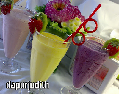 Judith cuma bikin Frappe dengan 3 macam rasa saja, nggak lebih ... ngirit untuk Sommer nanti... hi hi ... yaitu frappe dengan rasa Mango, Strawbery dan Blueberry. Nggak sulit cara membuatnya. Bisa dengan Icecream rasa apa saja.