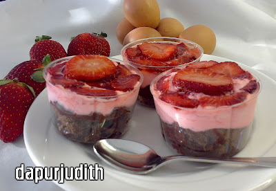 4. Susun strawbery diatas puding. Siram diatasnya dengan gula jelly. Biarkan dingin.